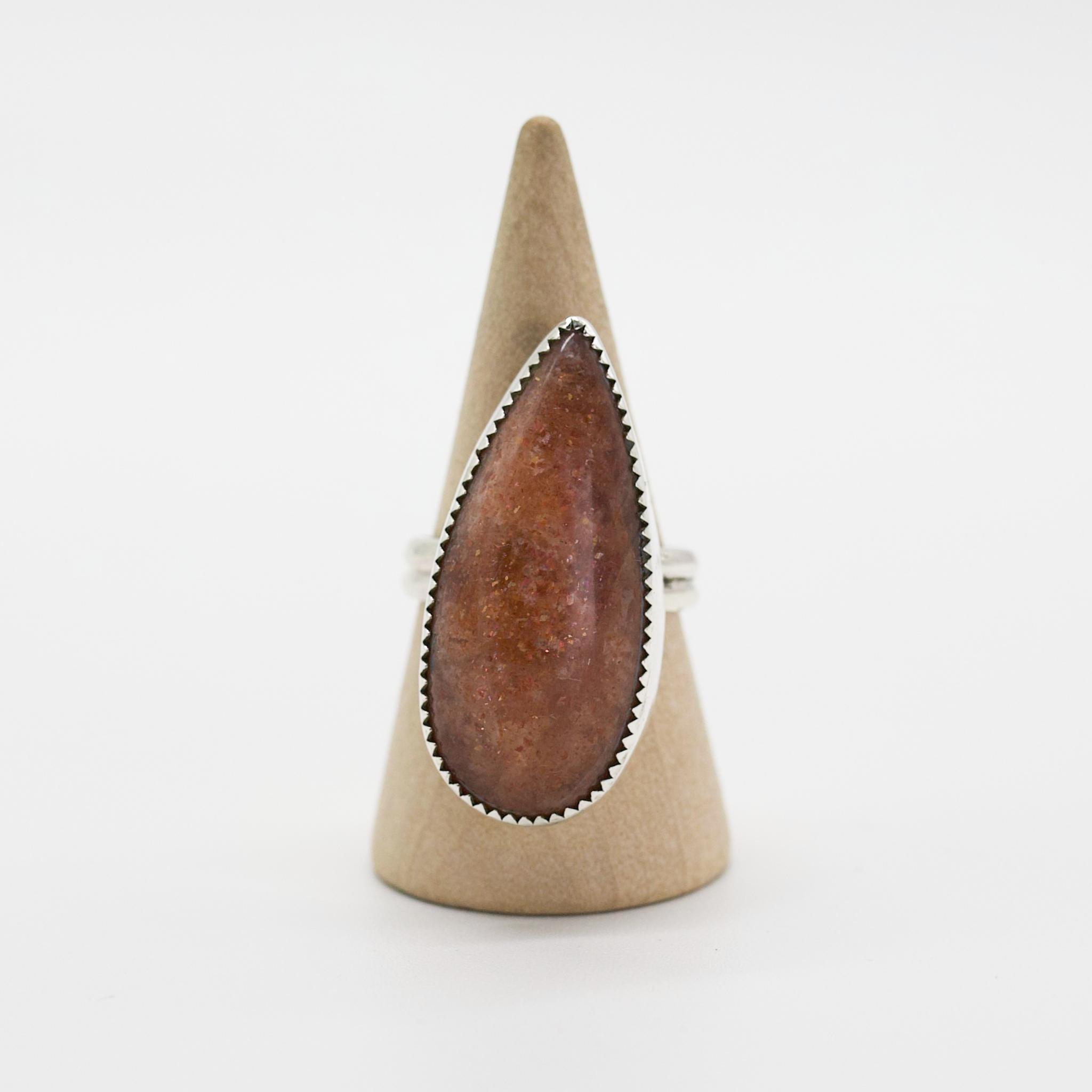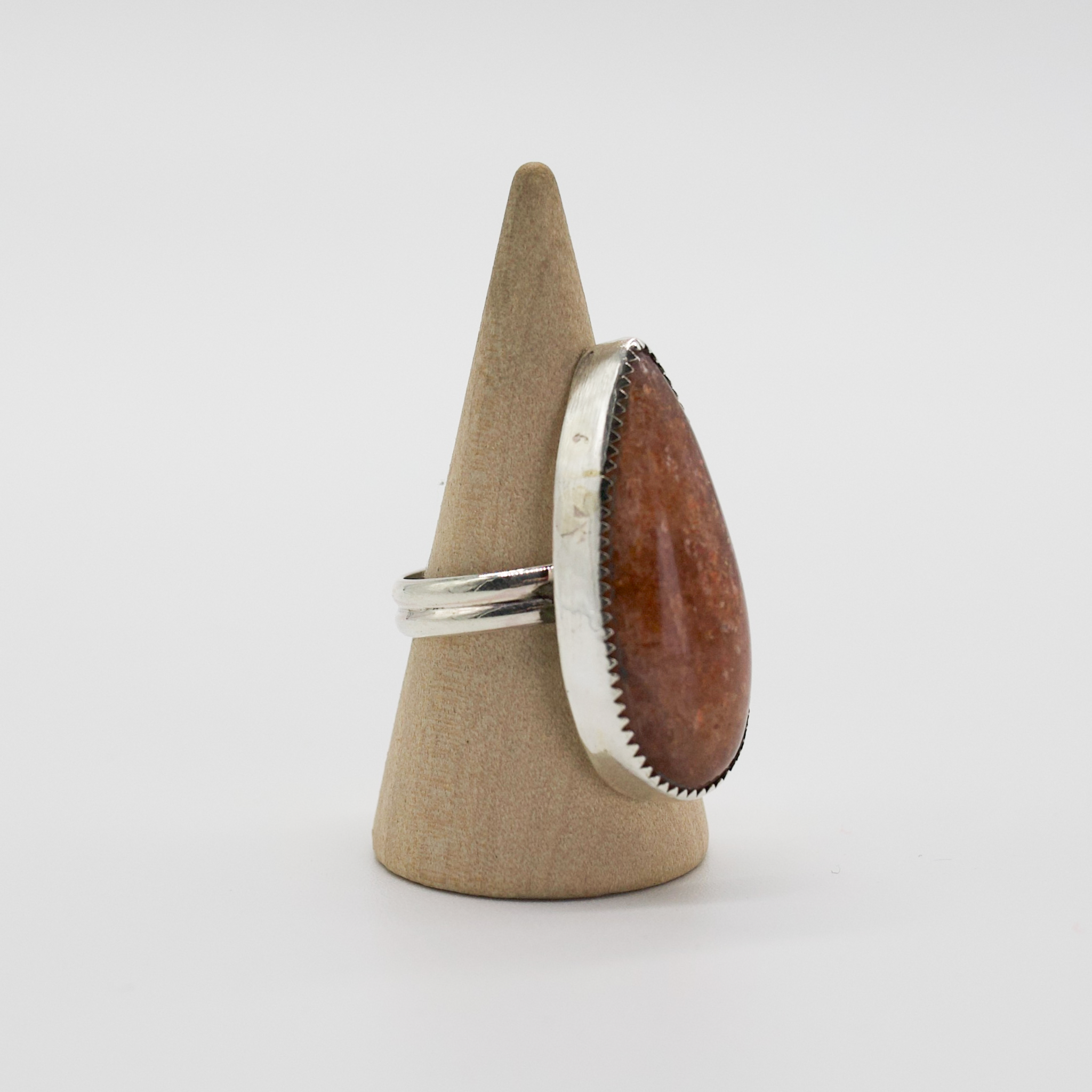 A fierce and fiery ring that feels like a blazing sunset caught in silver. The stone is Sunstone, glowing with warm, rusty-red tones and hidden flashes of golden sparkle that shift as the light hits just right. Set in a tall sterling silver bezel with a sleek double band, this piece is bold, radiant, and ready to steal the spotlight.