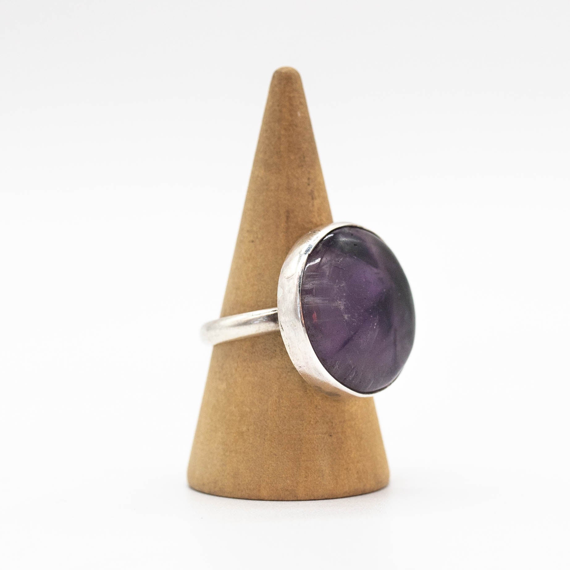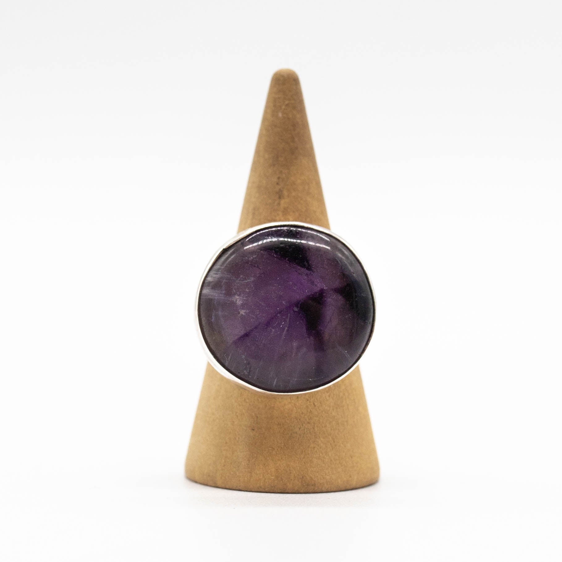A bold round amethyst takes center stage in this ring, set in a smooth plain bezel that lets the stone’s rich violet color shine. Paired with a simple, clean band, the design feels timeless and effortless. Minimal yet striking, it’s a piece that lets the natural beauty of the stone do all the talking.