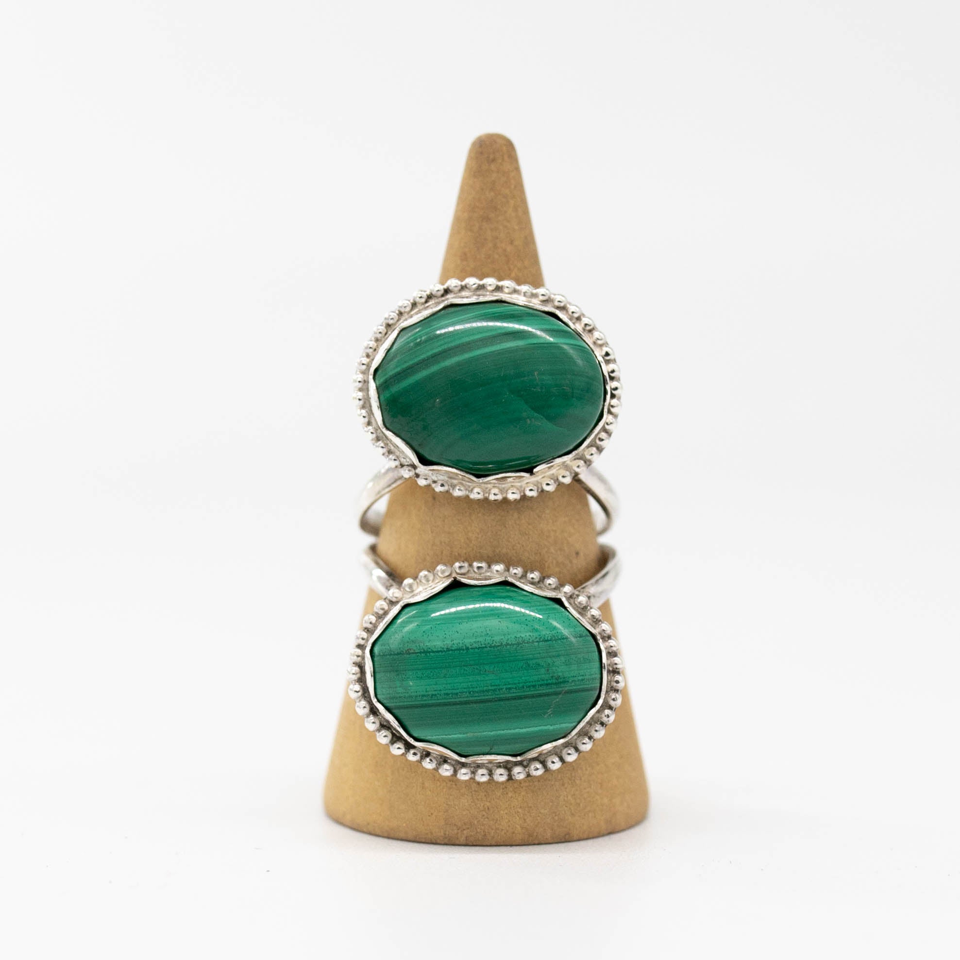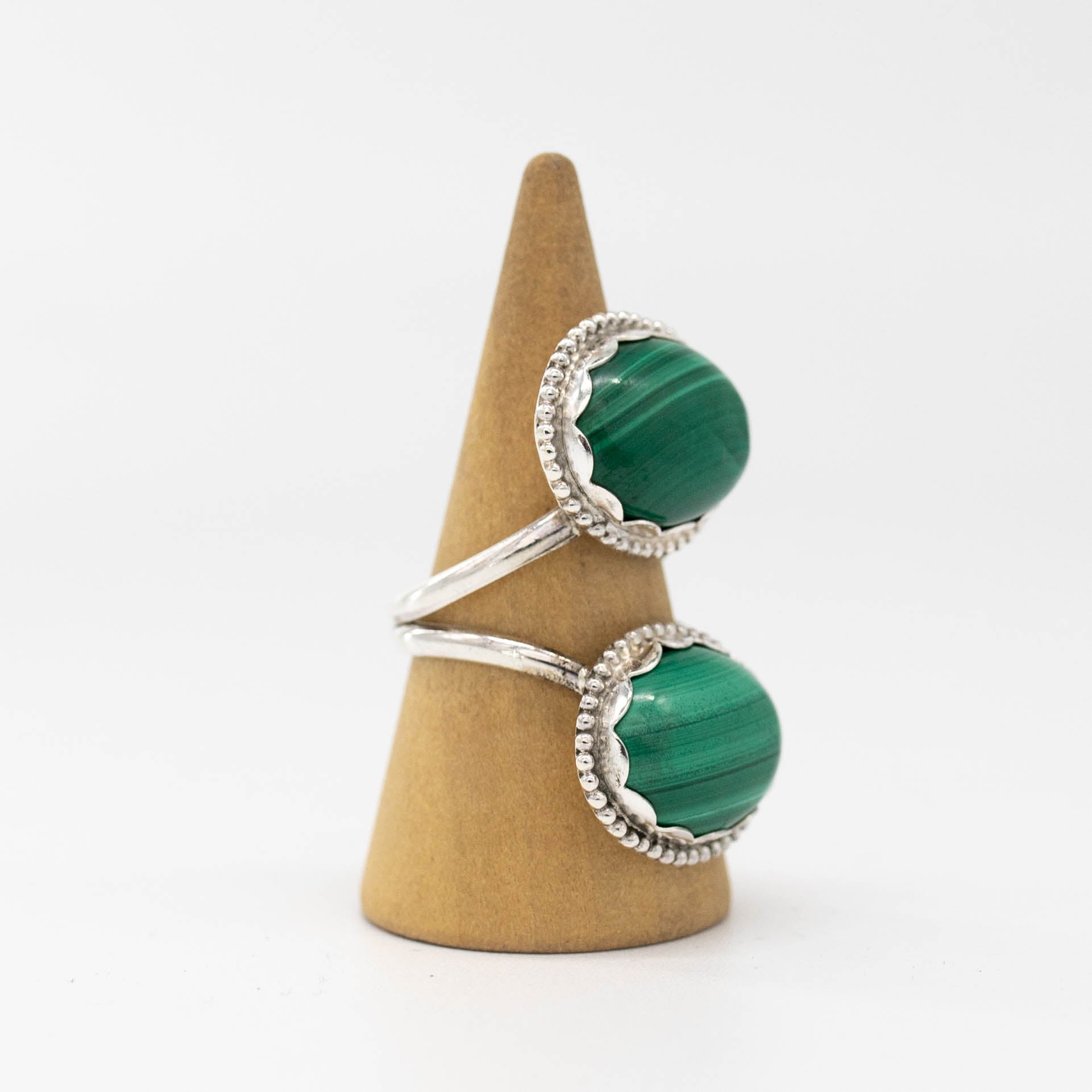 This double stone malachite ring features rich green gems set in scalloped bezels with delicate beaded detailing. The split band adds a modern touch, creating a balanced design that’s both bold and effortlessly elegant.