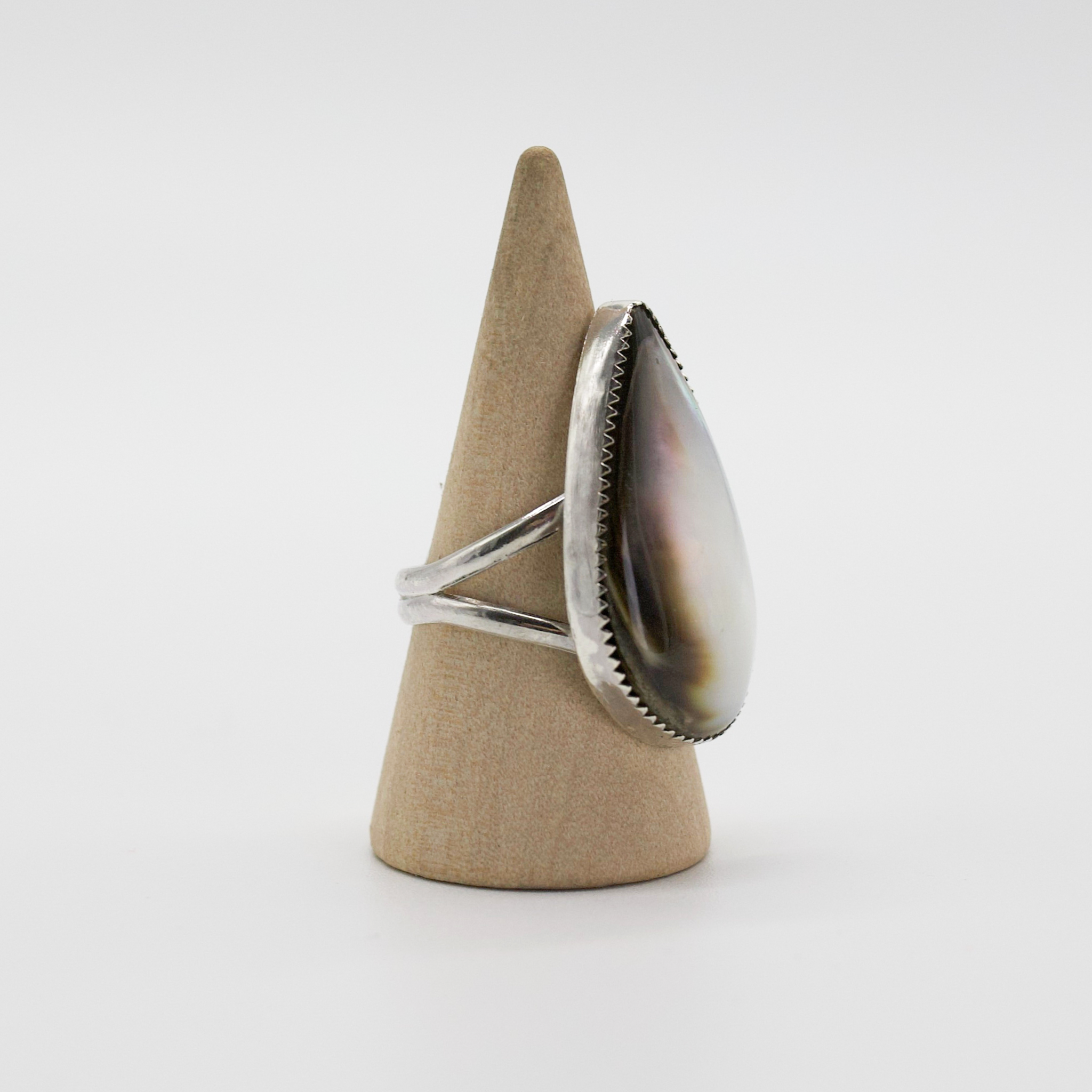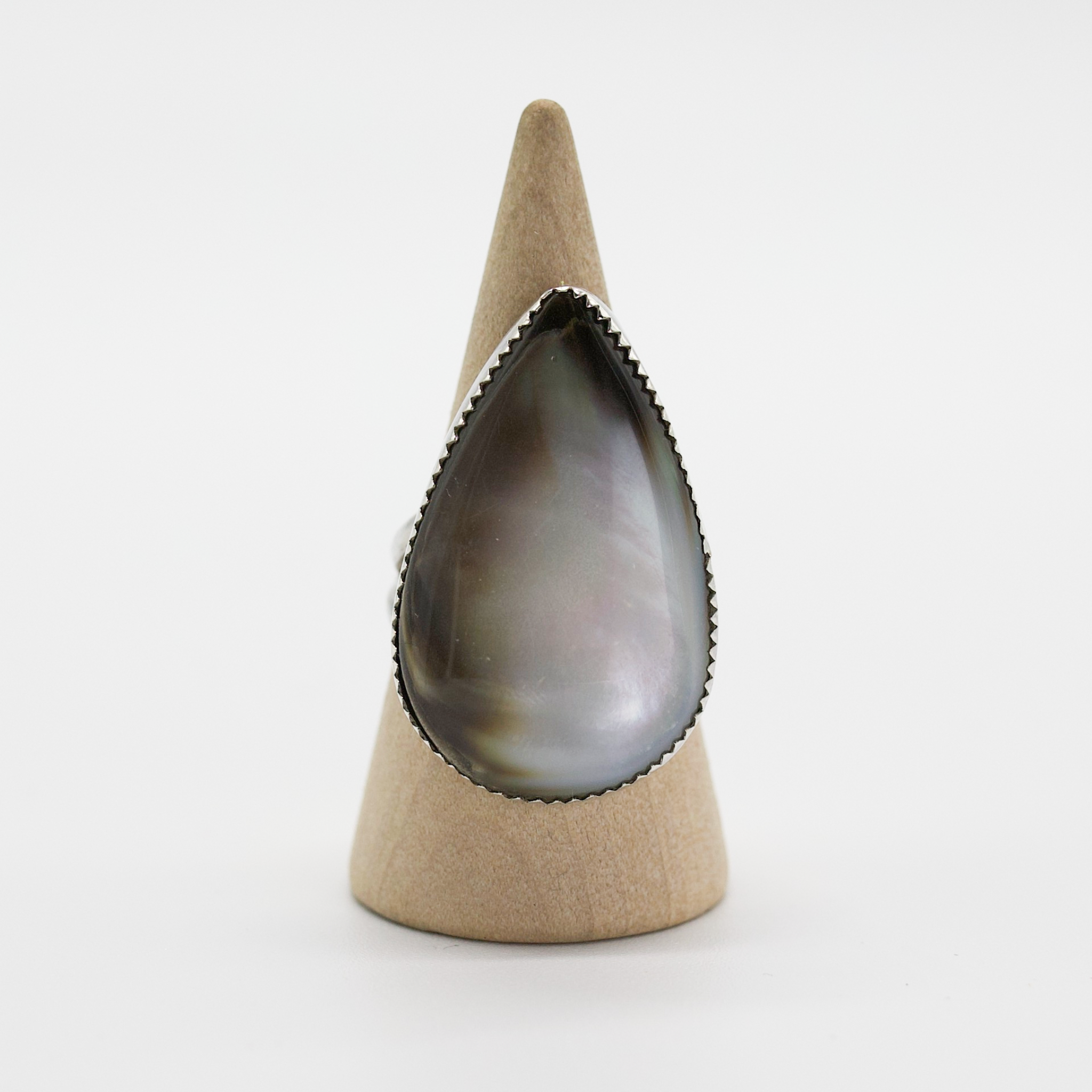 She’s moody, mysterious, and probably haunts tide pools—Goth Mermaid is here for the sirens who wear black (but shimmer). Crafted with Black Mother of Pearl, this teardrop-shaped beauty shifts between stormy gray and pearly silver, catching the light like moonlit waves. Said to invite calm, protection, and feminine magic, she’s basically your sea witch sidekick in ring form.