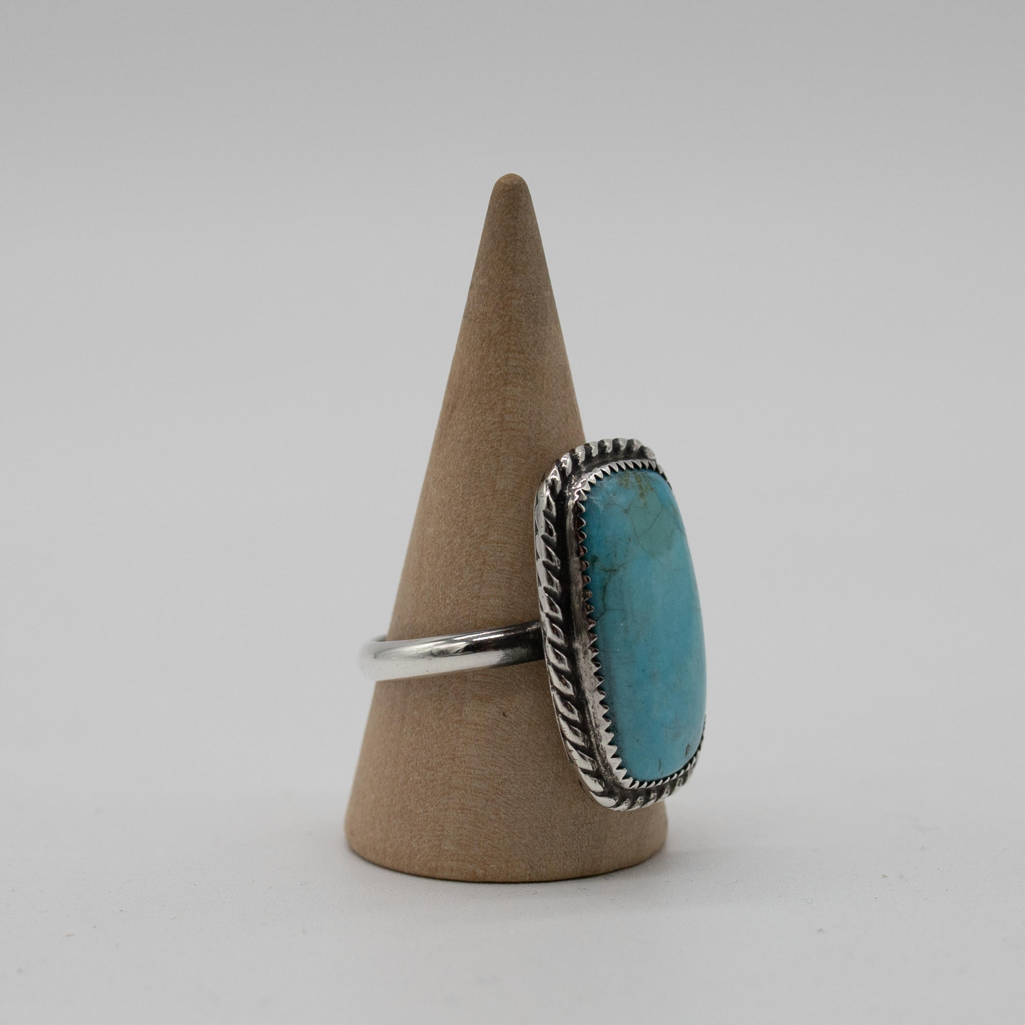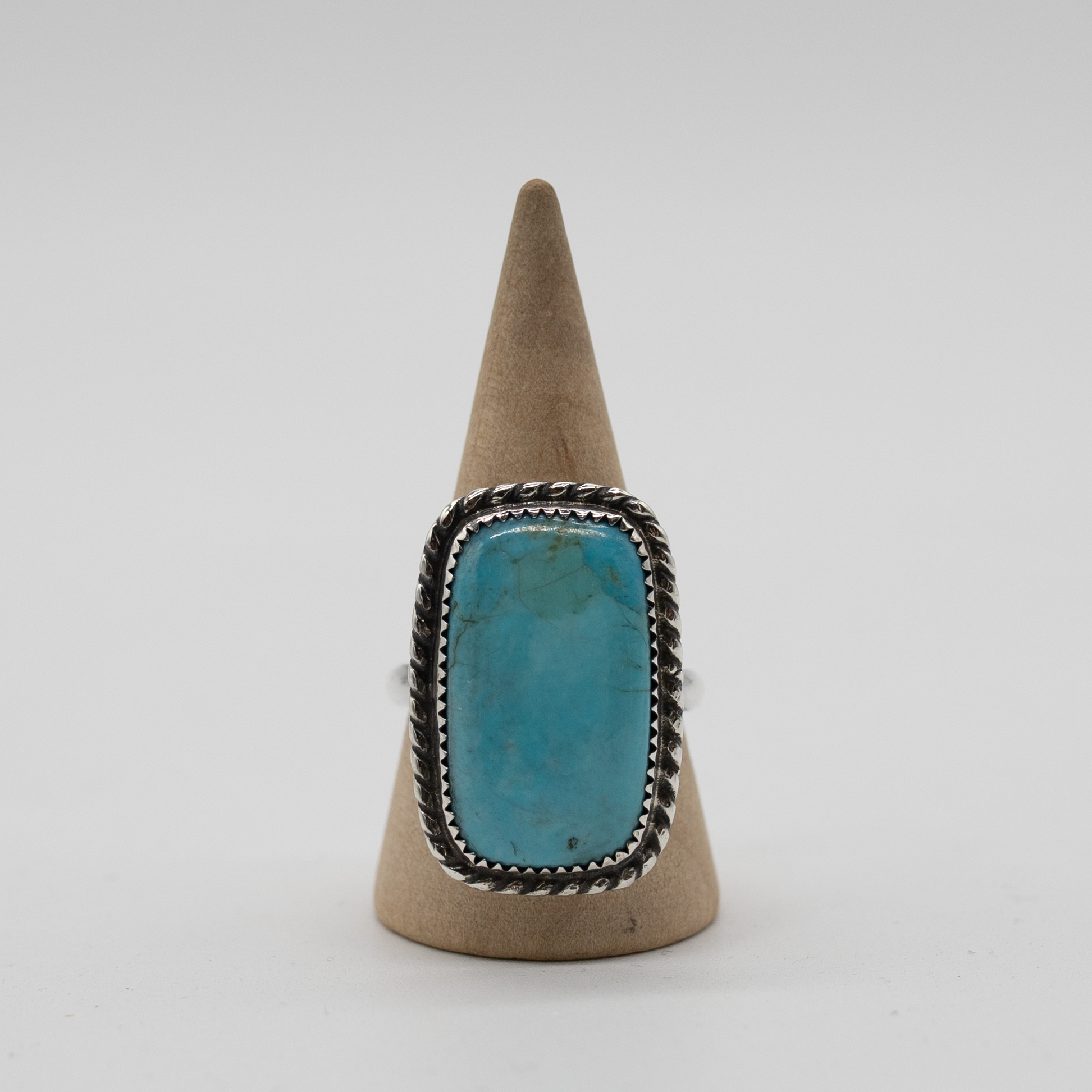 This bold statement ring features a striking rectangular Turquoise stone with natural matrixing and vivid sky-blue color. Finished with a detailed sterling silver rope bezel, it brings a clean, elongated silhouette and a touch of classic Southwestern artistry to your jewelry collection.
