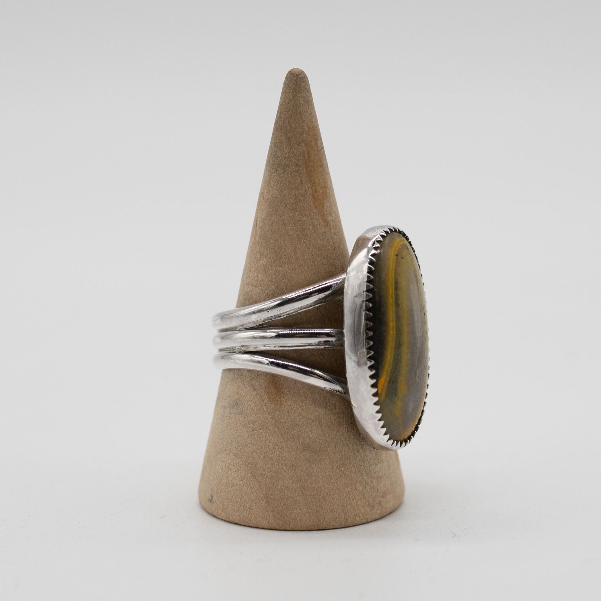 This handcrafted piece features vivid Bumblebee Jasper, known for its striking layers of yellow, charcoal, and warm earthy tones. Set in a serrated sterling silver bezel with a sturdy triple-band shank, it brings a bold, energetic look inspired by natural volcanic patterns and bright honey hues.