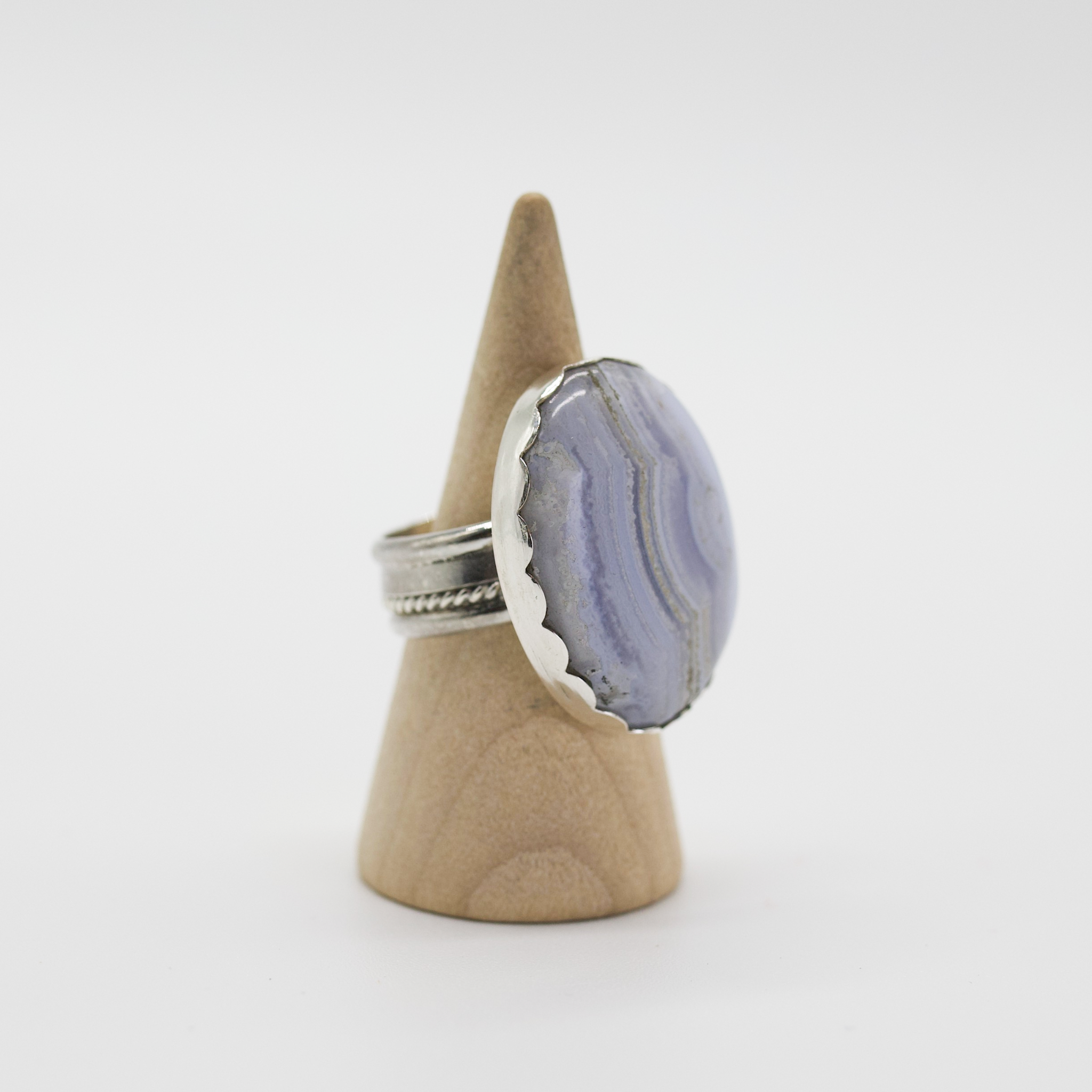 Ethereal and calming, Lavender Drift showcases a dreamy oval-cut Blue Lace Agate—a stone known for its soft, flowing bands of lilac, periwinkle, and misty white. This oversized beauty feels like a deep breath in ring form: soothing, elegant, and effortlessly serene. A gentle wave of tranquility for your hand