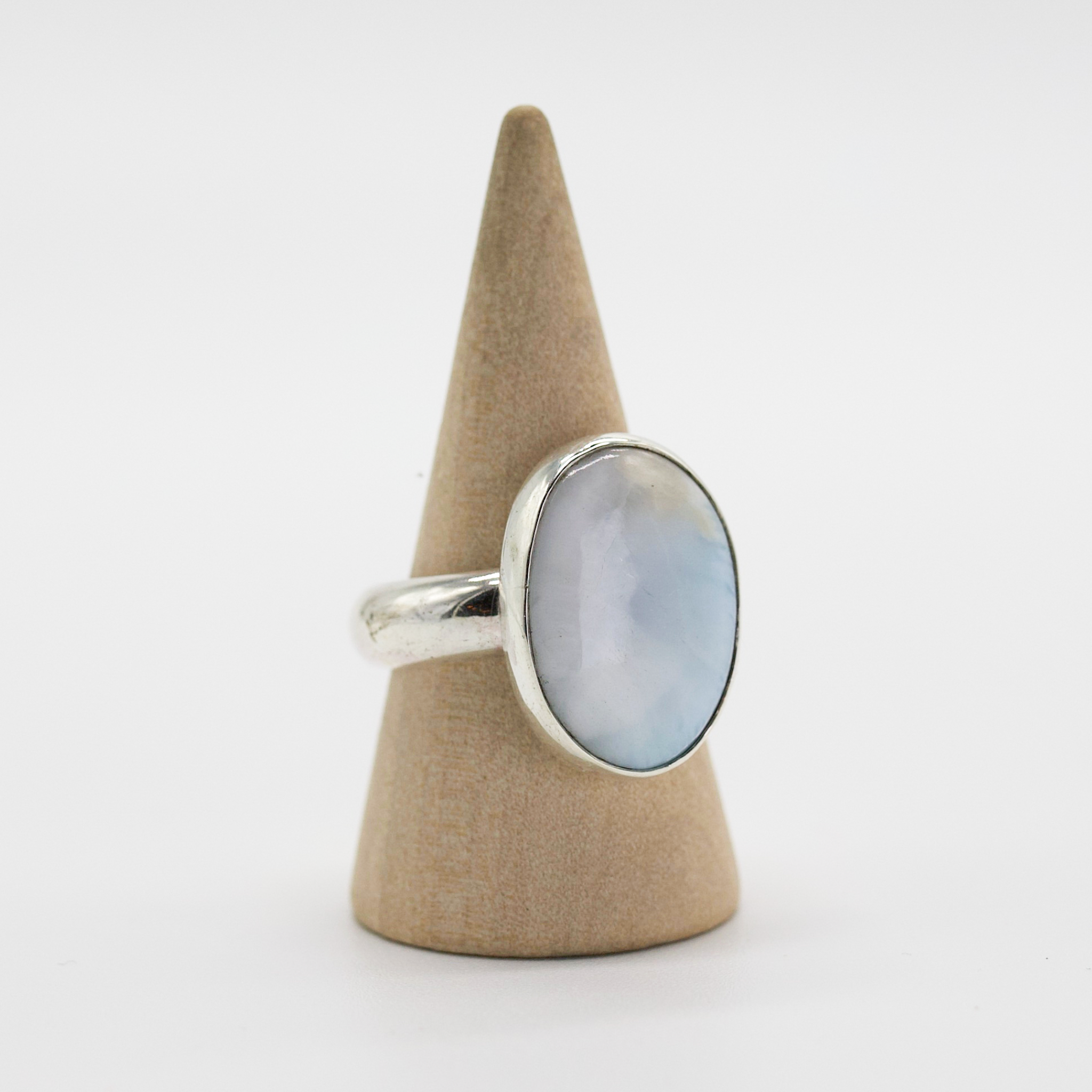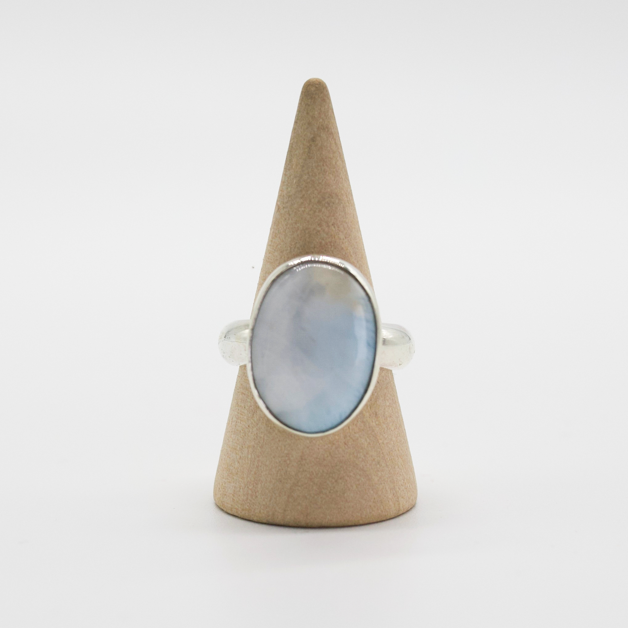 Soft, dreamy, and totally celestial—Moon Milk is like wearing a sip of stardust. With pale blue and silvery swirls, this ring features a glowing piece of blue chalcedony, known for calming energy and dreamy vibes. It’s the kind of piece that pairs best with a cozy night, a journal, and a little lunar magic.