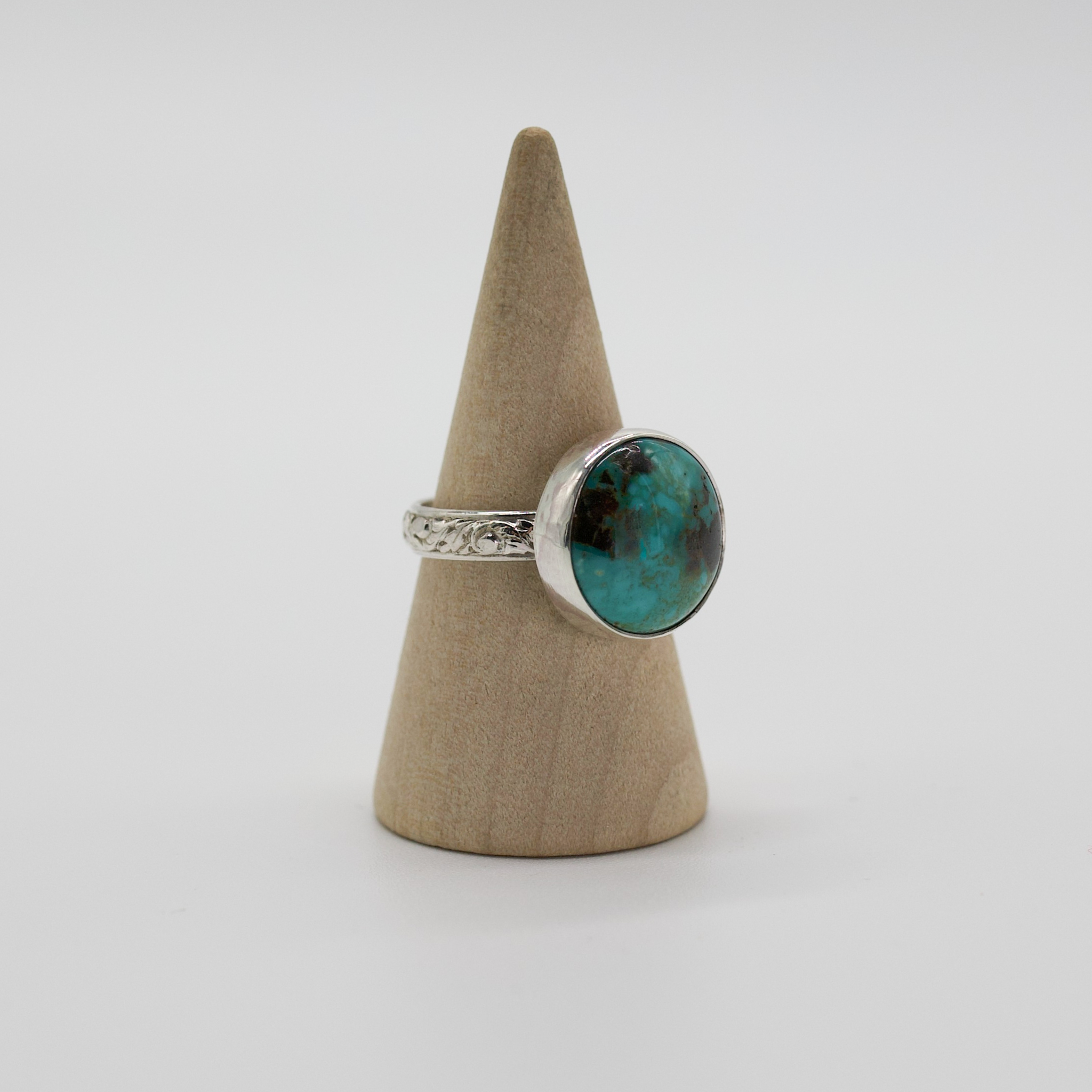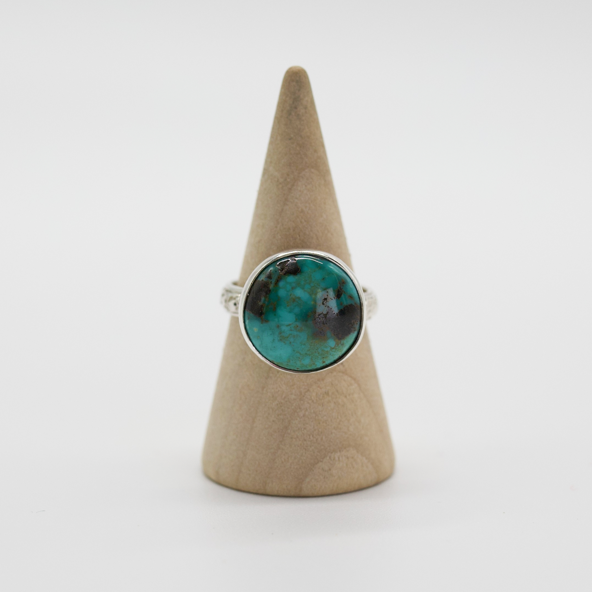 Mysterious and grounding, Moss Moon features a dreamy round-cut Turquoise stone, with deep forest inclusions and earthy undertones that feel like a secret garden at dusk. Set in a sleek sterling silver band with subtle stamped detail, this ring feels ancient, sacred, and just a little bit magical