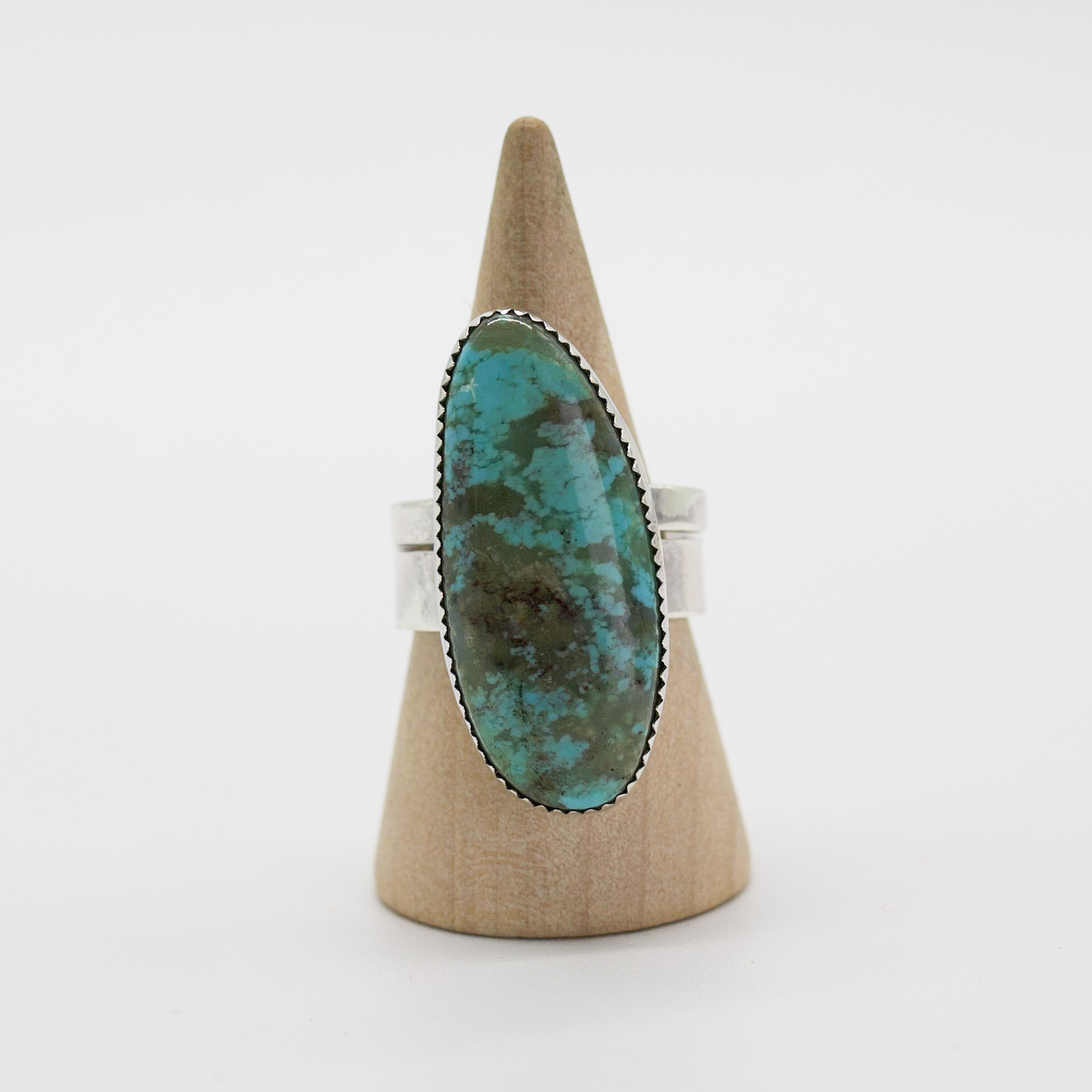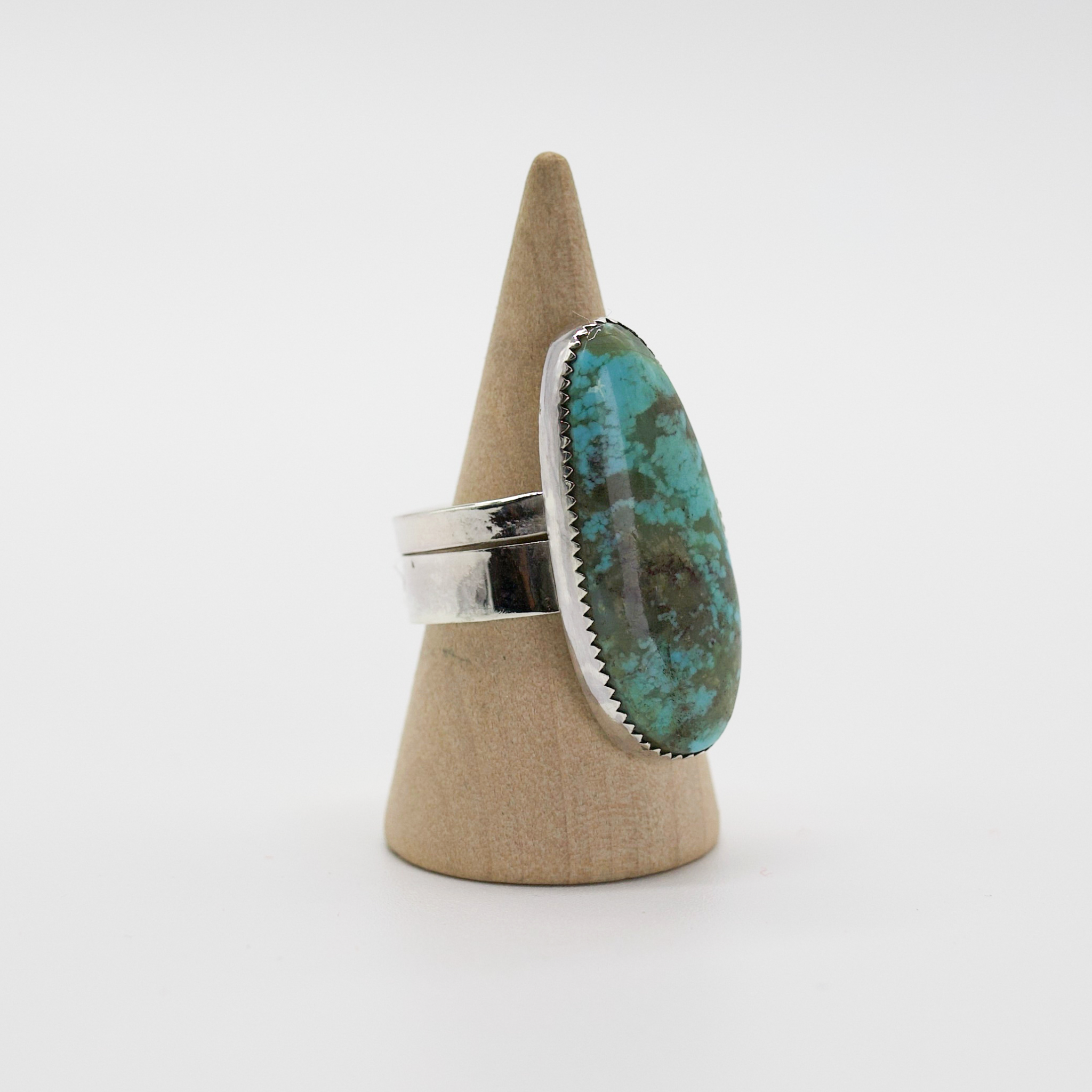 A serene stunner that feels like dipping your fingers into a desert spring. The stone is a deep and moody piece of Turquoise, layered with swirls of teal, seafoam, and earthy brown like mineral currents frozen in time. Set in a sleek sterling silver bezel with a wide double band, this ring radiates grounded elegance and adventurous spirit.