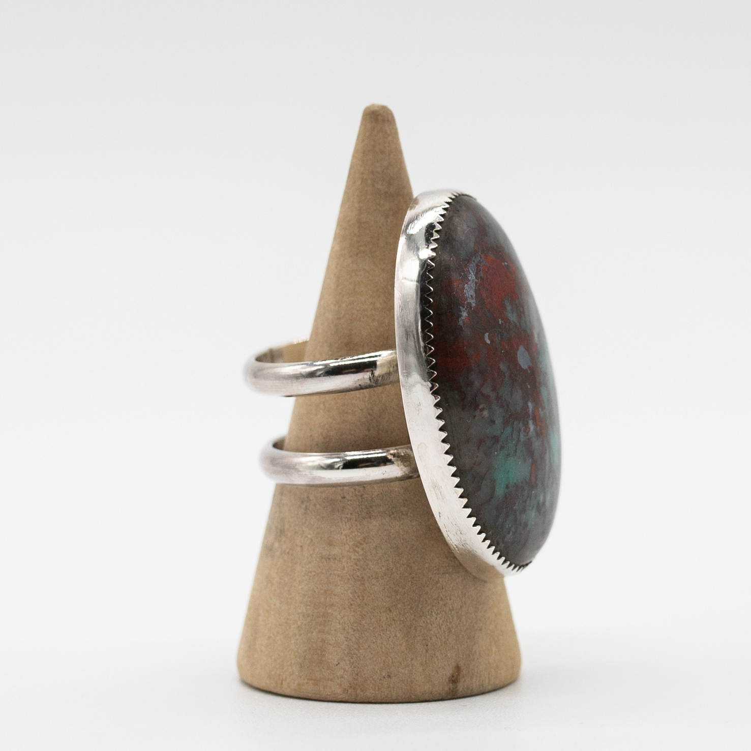 Shadow Ember is here for your mysterious era. This dark, fiery bloodstone ring mixes moody greens and burning reds in a cosmic swirl. It's giving volcano goddess meets midnight forest — a powerful piece for when you want your jewelry to speak first.