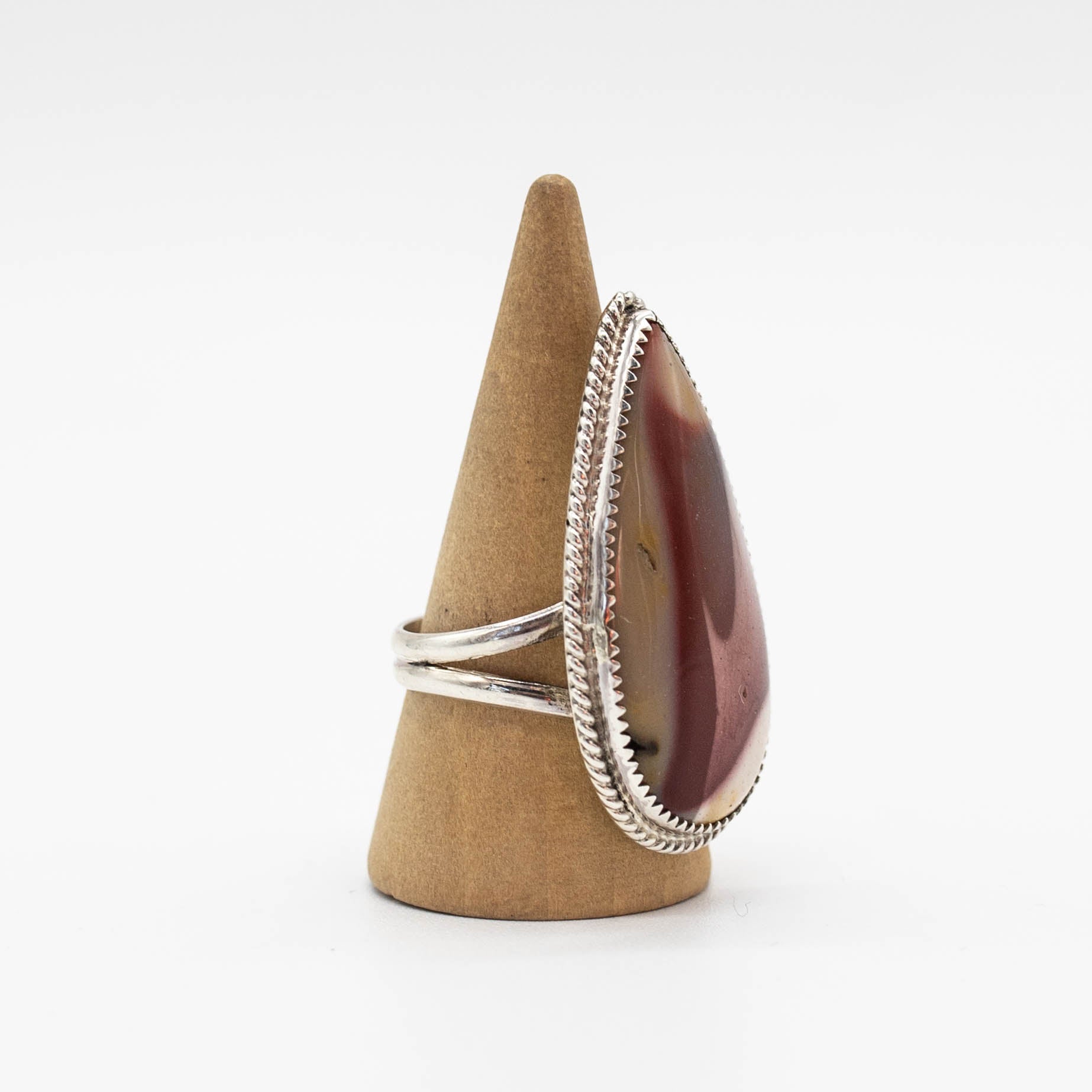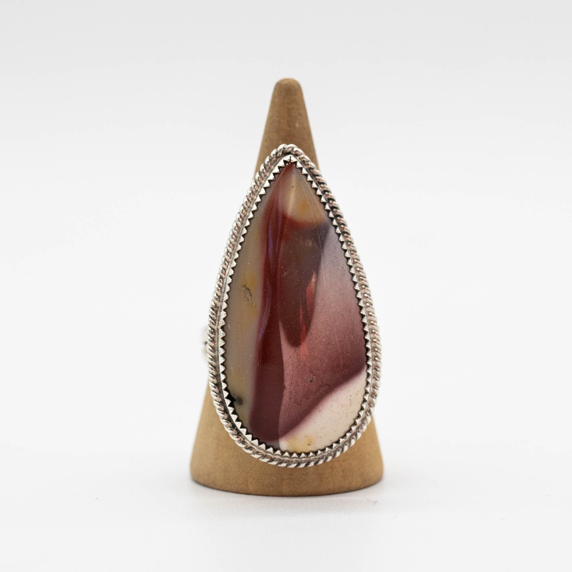 Earthy and elegant, this statement ring features a striking teardrop-shaped Imperial Jasper stone with rich natural tones. The stone is framed with delicate beaded detail and a serrated silver bezel that highlights its unique patterns and organic beauty.