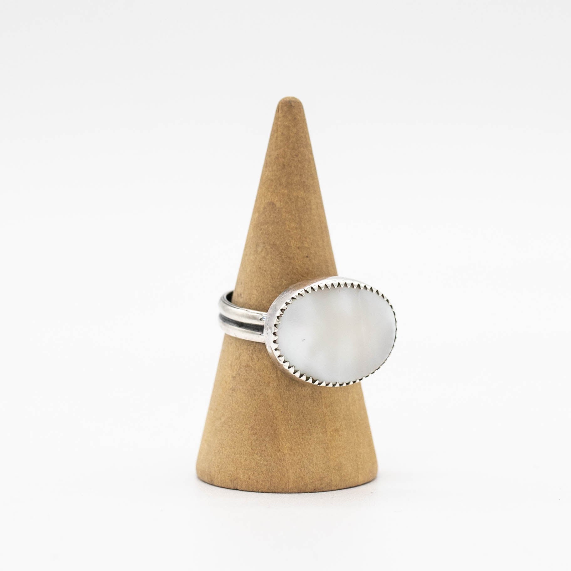 Swanlette is a luminous oval mother of pearl is set east to west in a serrated bezel, giving the piece a subtle vintage-inspired edge while highlighting the shell’s soft, iridescent glow. The band features a double half-round design that adds gentle dimension and balance. Elegant yet distinctive, this ring has a refined, handcrafted charm.