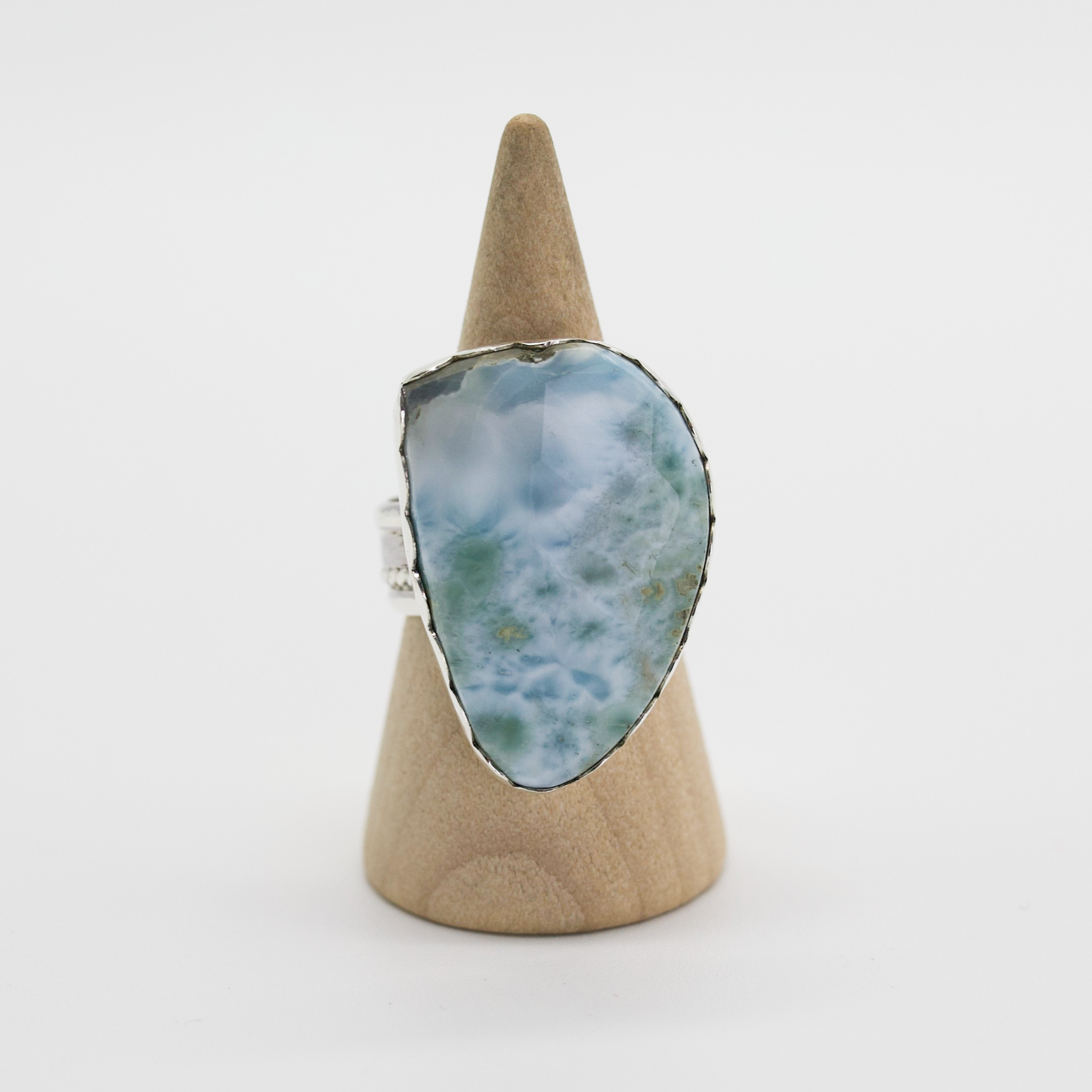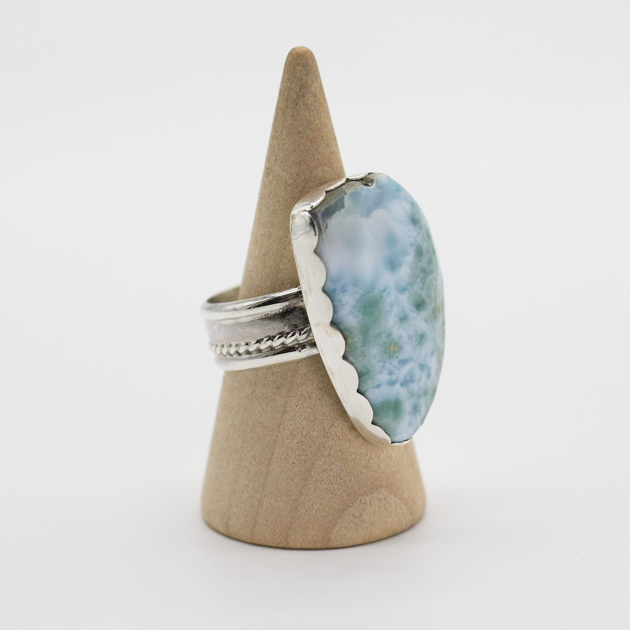 A dreamy, ocean-born ring that looks like it was sculpted by waves and kissed by the clouds. The stone is Larimar, a rare gem found only in the Dominican Republic, with soft blue and white marbling that mimics the sea and sky in perfect harmony. Set in a hand-cut sterling silver bezel with subtle scalloped edges and a textured band, this piece is like a little vacation for your hand.